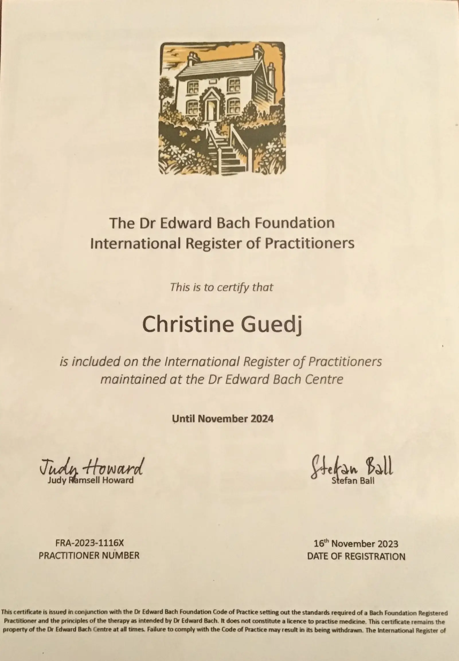 Formée et certifiée BFRP par la Bach Foundation International Register of Practitioners, Christine Guedj accompagne chaque personne grâce aux Fleurs de Bach et à une approche profondément holistique. Son engagement repose sur l’écoute, le respect de l’individualité et l’harmonisation des émotions qui perturbent le quotidien.